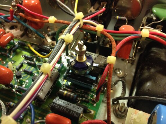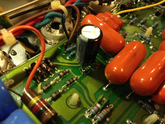 The electrolytic can capacitor’d grounding posts did not fully bond to the chassis. By applying pressure to the can cap the ground bond is improved thus lowering the noise floor.